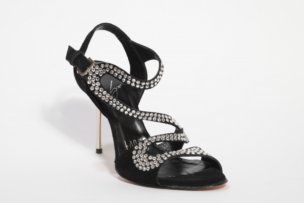 Modello di scarpa molto ricercato ed elegante, è stato realizzato su camoscio nero con strass ghiaccio.